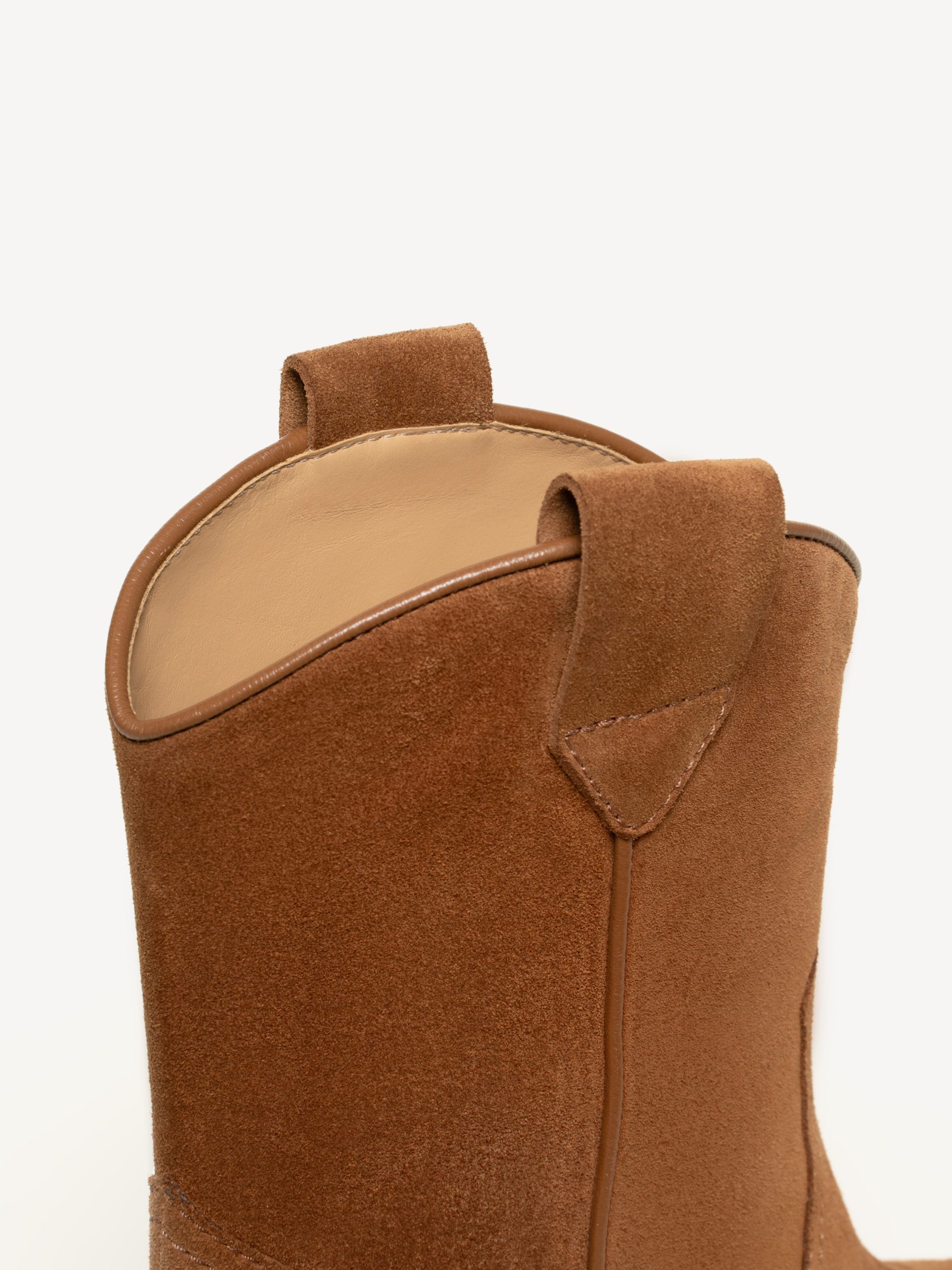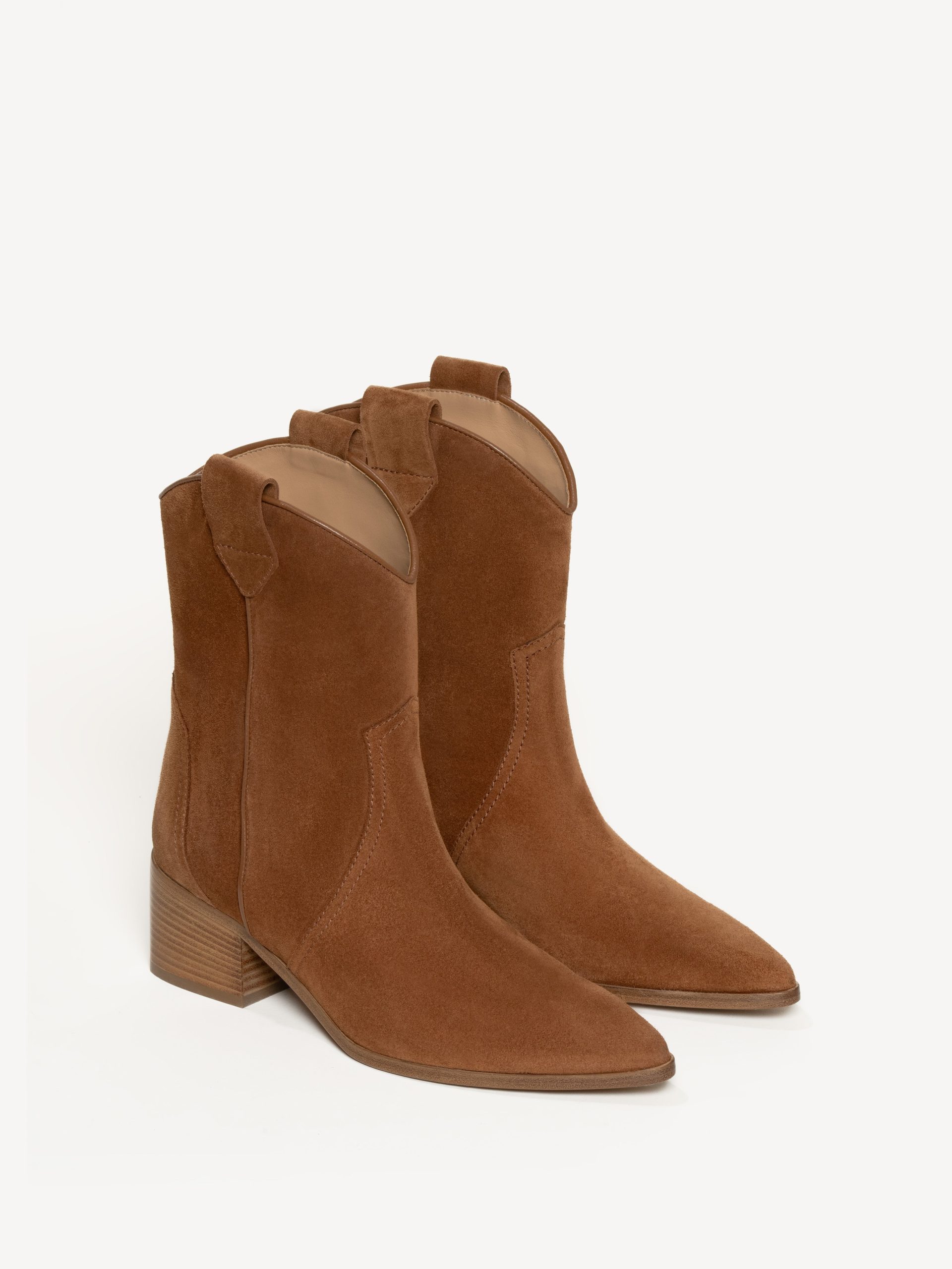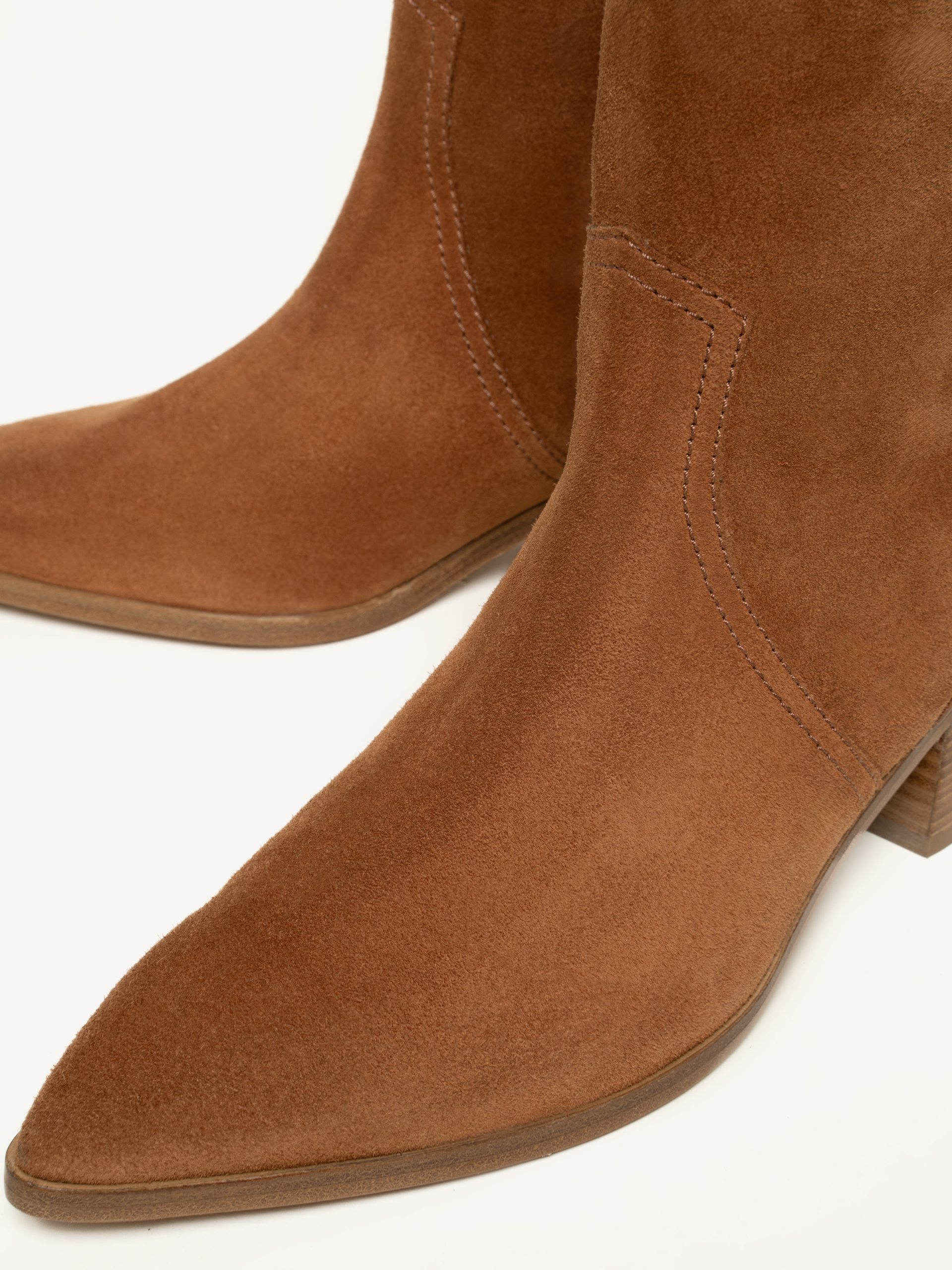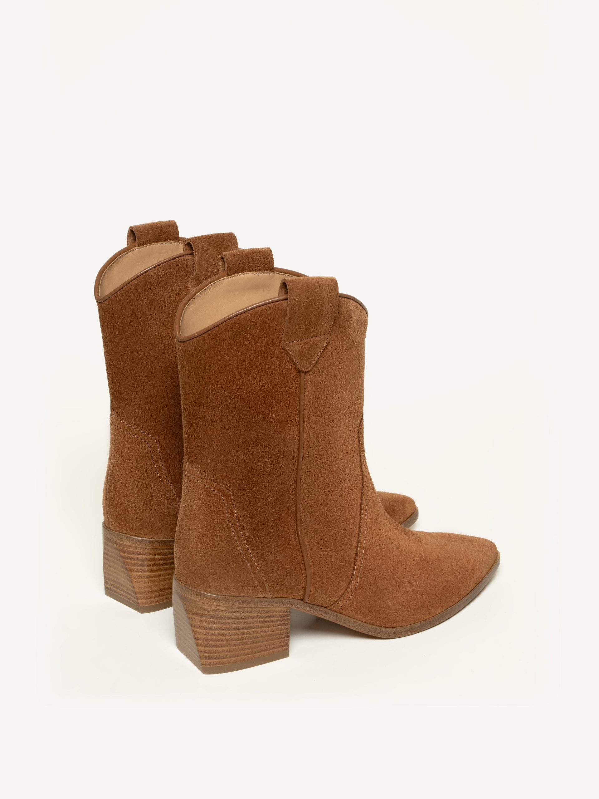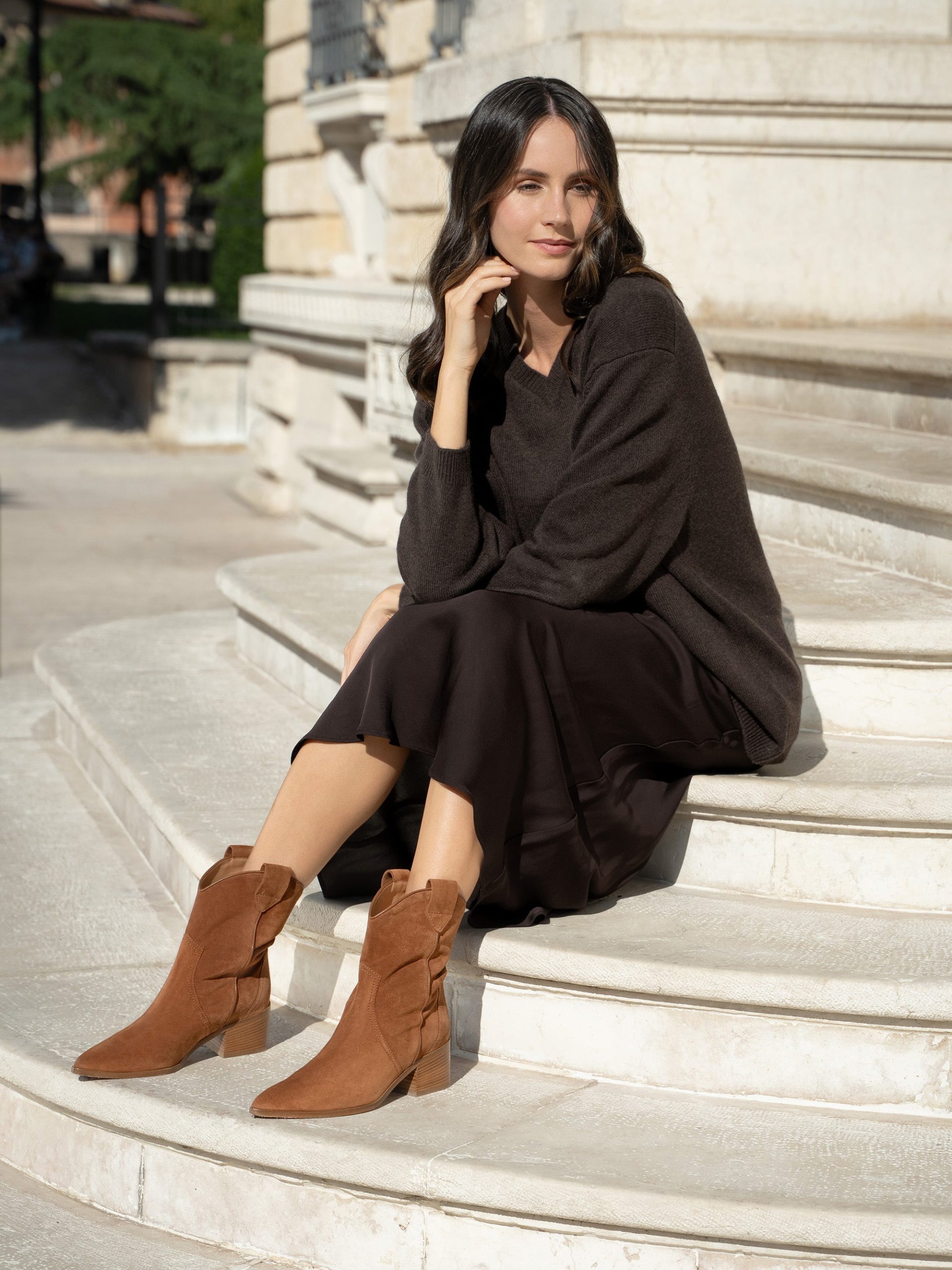 A Western bootie made the Italian way, The Rita Basso is handcrafted from luxuriously soft suede with a hint of slouch. From the smooth leather piping and tonal stitching to the hand-painted welt, every inch is thoughtfully considered for both style and utility. The mid-calf shaft and mid-height heel mean it pairs well